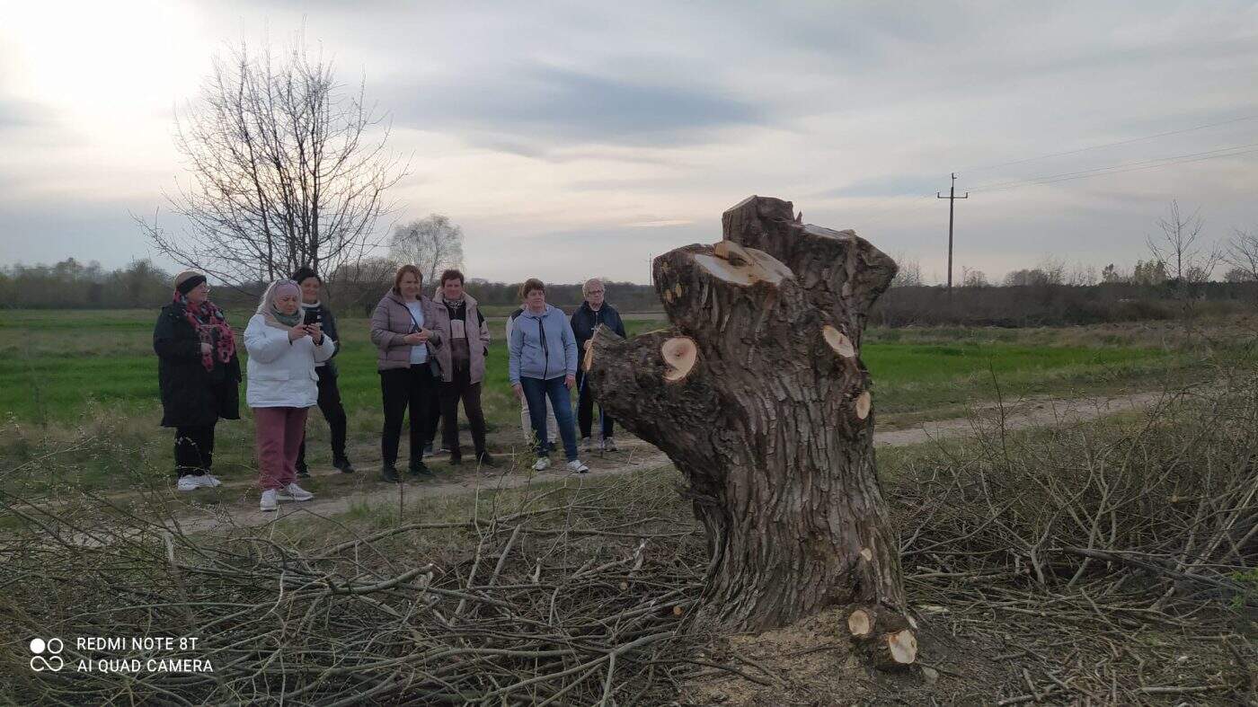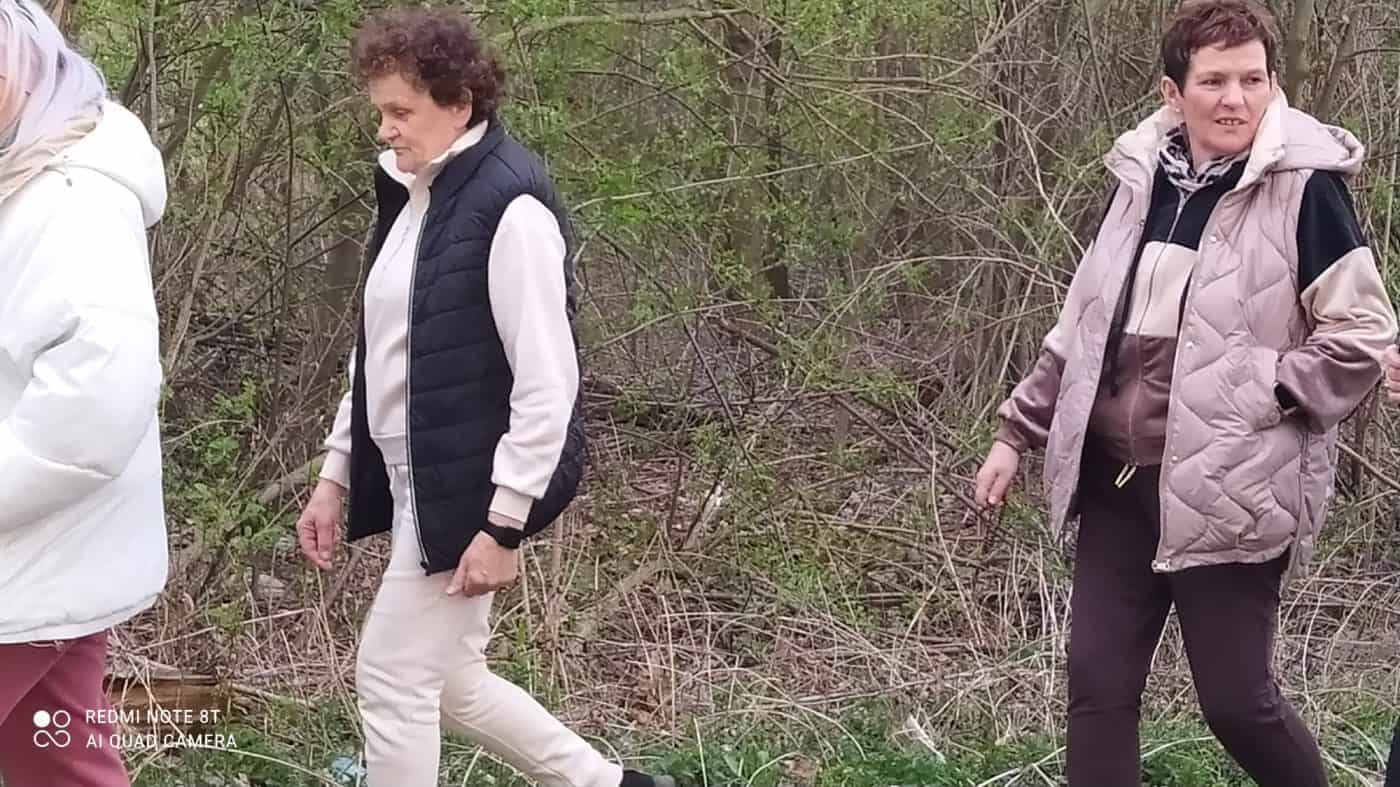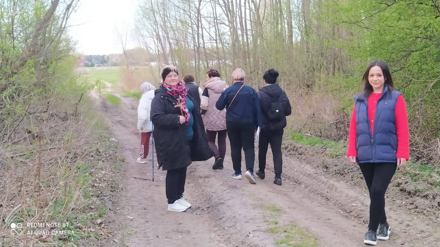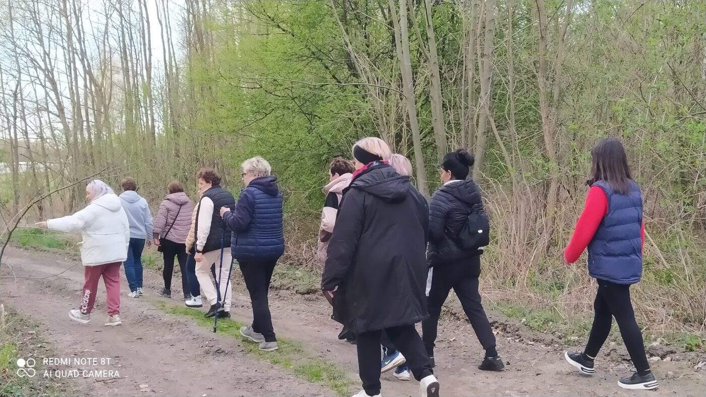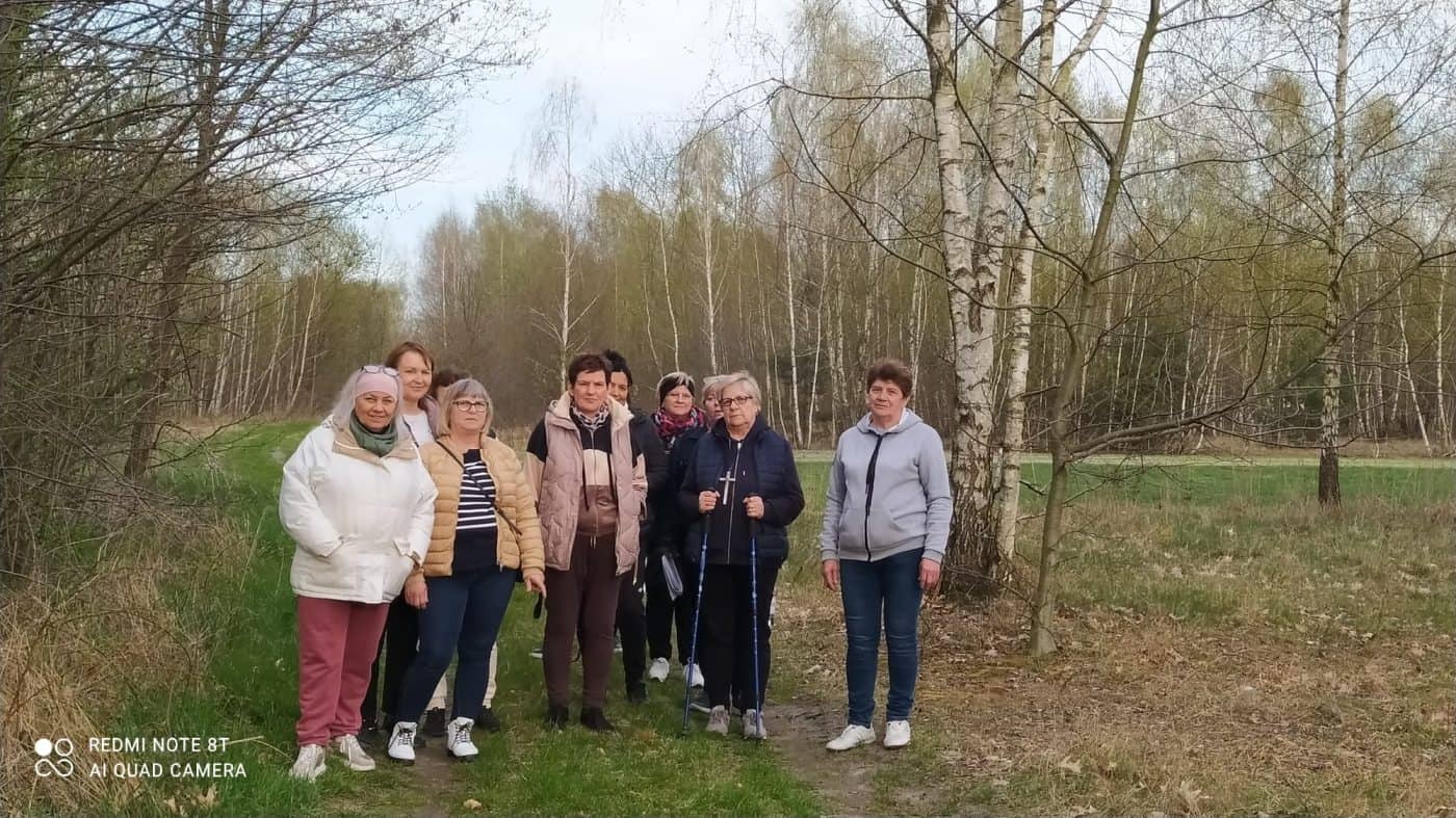 W pochmurny, ale ciepły dzień grupa wybrała się na spacer po okolicy. Należało wyjść poza zabudowania, aby dostrzec, że jeszcze do niedawna smutne, poszarzałe drzewa i bezlistne krzewy pokryły się cudowną delikatną zielenią. Spacerowaliśmy wokół naszego sołectwa.
